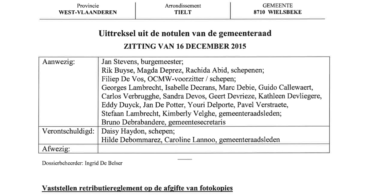 Sedert 1 januari 2016 is er een gemeentelijk reglement op de afgifte van fotokopieën van toepassing. Dit reglement werd met eenparigheid van stemmen goedgekeurd in de gemeenteraad van 16 december 2015. Hierdoor kunnen Wielsbeekse verenigingen tegen kostprijs kopieerwerk laten uitvoeren bij de Dienst Vrije Tijd. Er is ook een uitzondering voorzien voor volgende verenigingen die dit kosteloos kunnen doen: Ziekenzorg (nu Samana), OKRA, Neos, De Zonne, Rode Kruis, JMA, kerkbesturen en eigen adviesraden.
